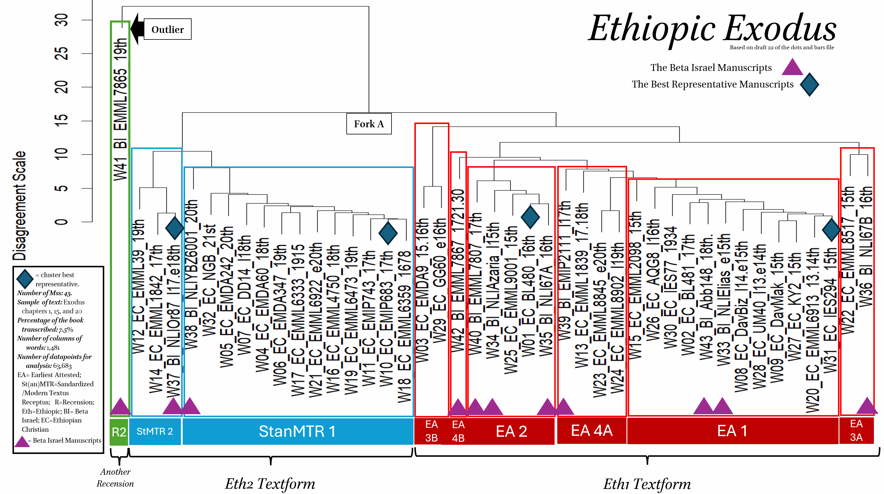 The jpeg shows the Dendrogram produced by feeding the R file and a CSV (comma separated values) file into the R program to generate a dendrogram. The colored boxes and stars represent our interpretation of the dendrogram, and become our working hypothesis for investigation of the book. Click the image on the left the dendrogram. Click the image on the right to see a video on THEOT Dendrograms and How to Use them.